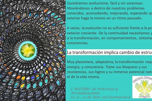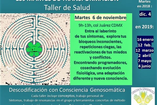 ¿Porque un martes de transformación? La inercia no es vida. El movimiento en consciencia nos hace evolucionar. ¿Porque un taller de salud? La enfermedad es solo una consecuencia, nuestro enfoque va a la raíz, a la salud, resultado del renacer de nuestras fuerzas adaptativas plenas. En grupo, el camino se facilita. Entendiendo que nuestra información heredada, nuestras vivencias conflictivas actuales, del pasado, y nuestros síntomas de hoy, pueden equilibrarse en lugar de confrontarse.
